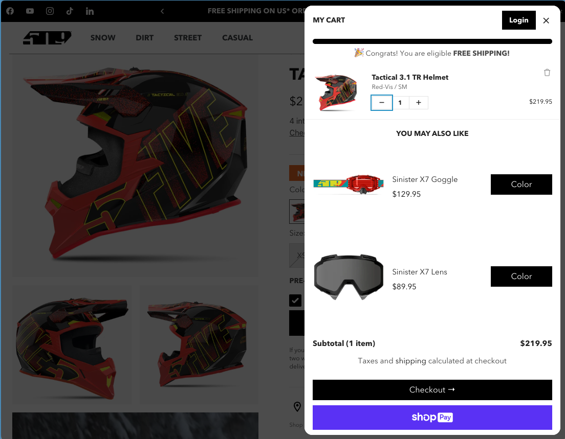 Rebuy played a critical role in this transformation. By embedding Rebuy into product pages, cart, and checkout, 509 gained advanced merchandising and personalization tools that with a focus on product discovery, boosting average order value, and creating new ways to surface relevant gear to riders. Paired with Shopify’s extensibility framework, the new checkout experience is both compliant and optimized for growth.